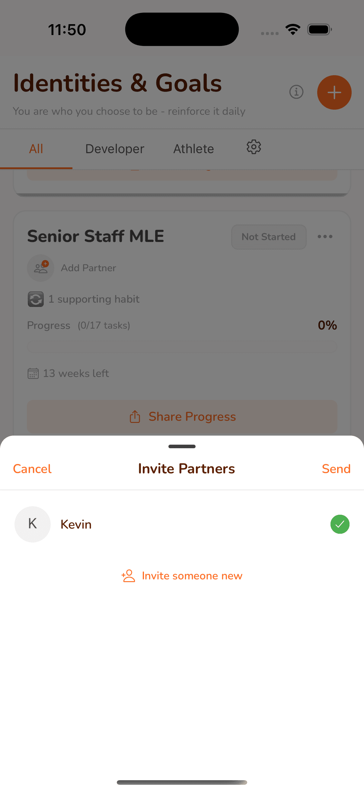 Invite a friend or partner to see your progress. They can send nudges when you're stuck and celebrate when you hit milestones.