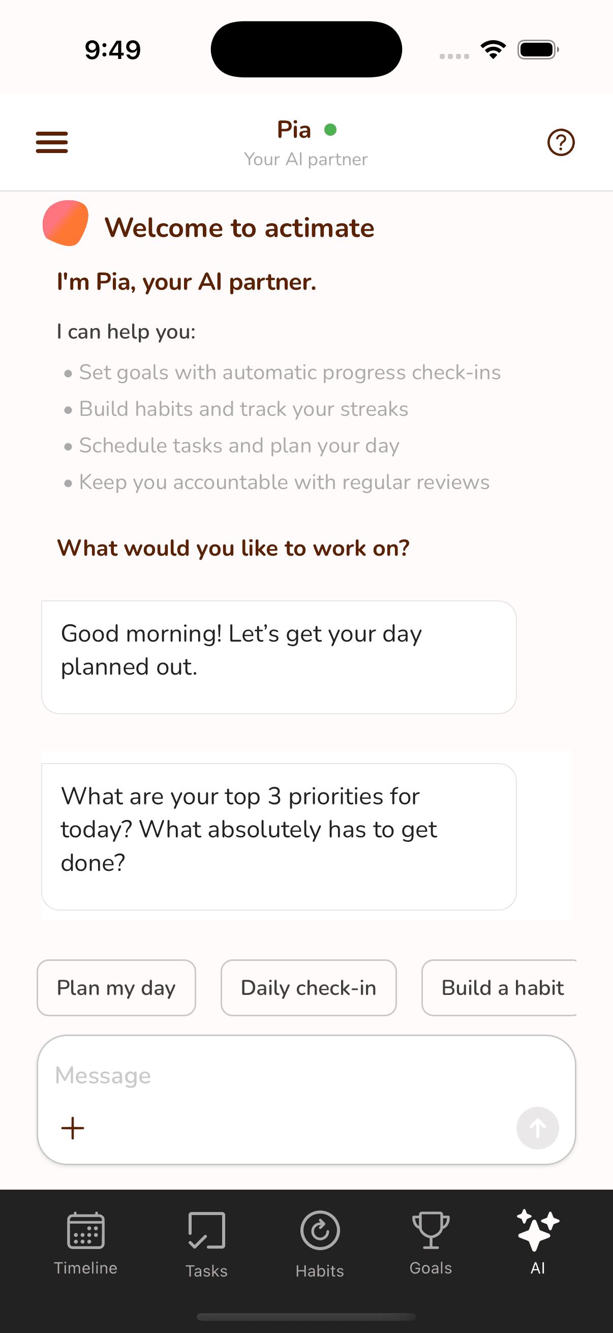 Pia isn't a chatbot that waits for you to ask. She checks in at the times you set, asks about your progress, and follows up on the goals you've been avoiding.